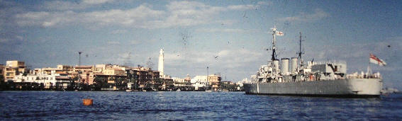Manxman was engaged in the bombardment of the Port Said area. I well remember the night of 5th November 1956 as the biggest (for us) Guy Fawkes Night ever! Many ships of several nations were lying off the Port. At times the air and sky seemed to be filled with shell-blasts and next morning we could see three huge plumes of smoke rising from the oil storage tanks which had been hit by the bombs and shelling. A Hospital Ship was lying a few hundred yards from us and helicopters were conveying wounded men to her. The saddest moment for me was when I saw a fatal incident involving a military helicopter. The aircraft was loaded with wounded personnel, so I understand. It was flying low when a huge wave caught its undercarriage and took it straight down like a stone, just a hundred and fifty yards from us. There were plenty of small boats scuttling around the area but nothing could be done, so far as I could see, apart from the rescue of one man who escaped in a life-raft.